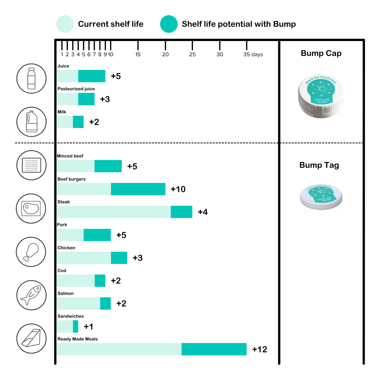 For food and drink producers, Bump helps extend expiry dates and reduce waste without compromising safety or quality. Here's the numbers of extra days you can get on various foods.